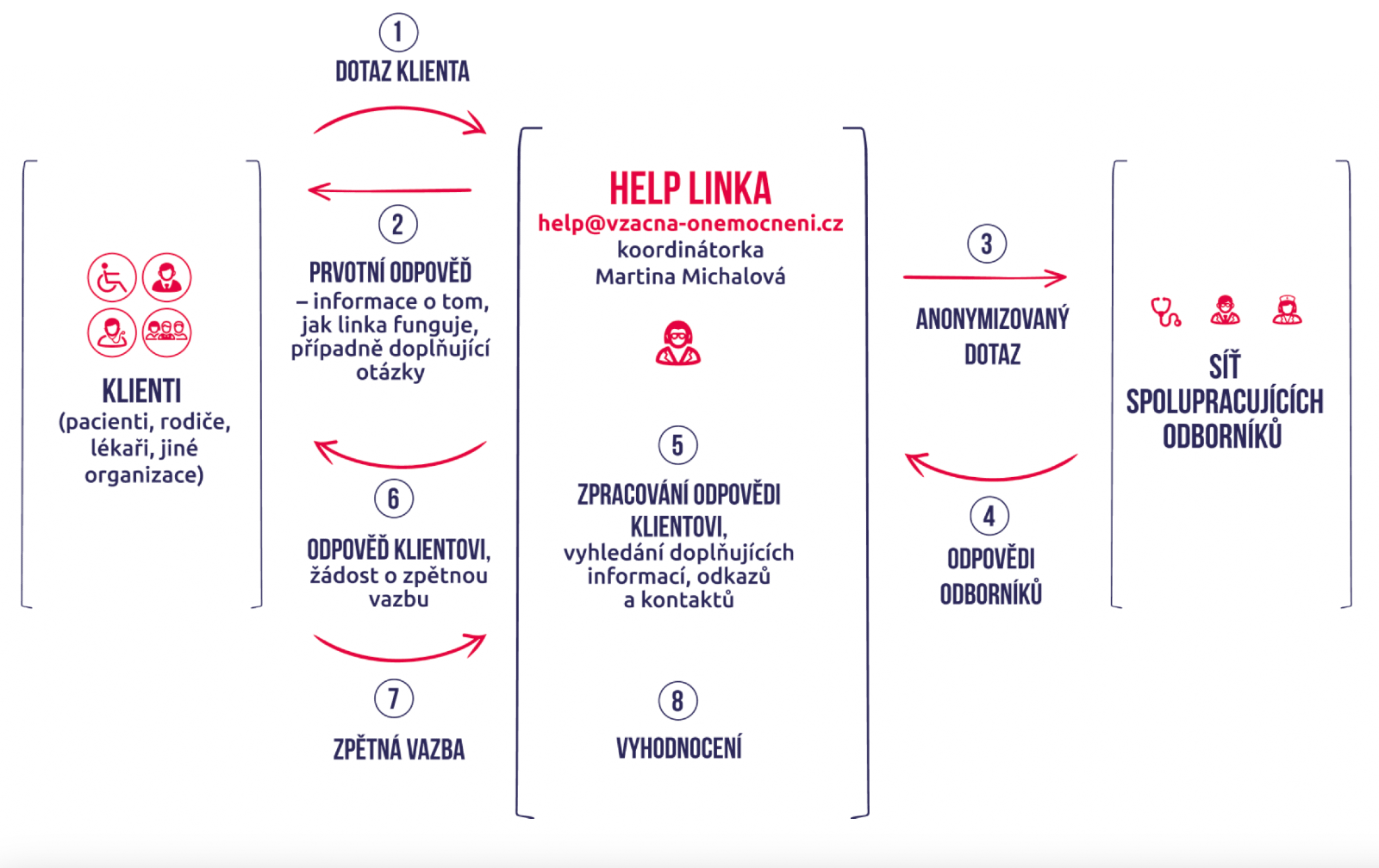 Nejistota a strach, které vzácná onemocnění často provází, má na pacienta a jeho rodinu závažné dopady. Projekt help linky má za cíl zejména propojit pacienta se správným odborníkem nebo přímo vhodným specializovaným centrem pro vzácná onemocnění a přispívá k následnému zajištění odpovídající péče díky širokým kontaktům na specializovaná pracoviště a organizace, jež jsou zaměřeny na jednotlivá vzácná onemocnění.